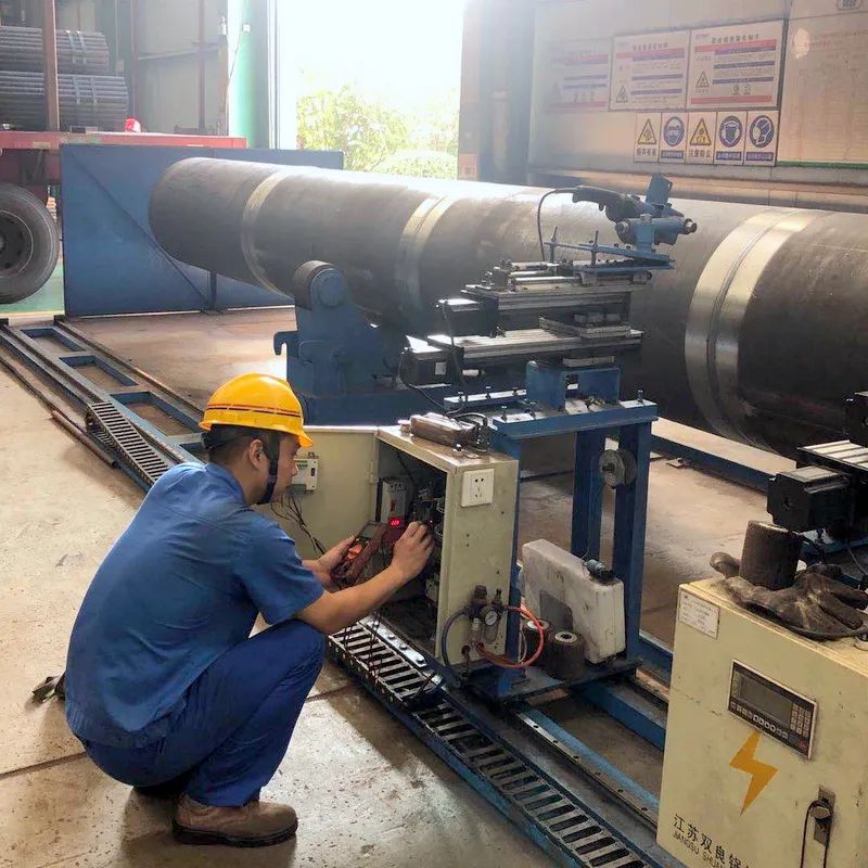 類似設(shè)備技術(shù)改造,吳昊參與完成的項(xiàng)目數(shù)不勝數(shù),比如雙絲埋弧焊焊接電器改造、所有埋弧焊機(jī)無線遙控改造、組隊(duì)滾輪架拼裝焊接改造、水管鍋筒焊接機(jī)器打磨、模式壁自動(dòng)焊的電焊機(jī)改造等項(xiàng)目。就在剛剛他又和機(jī)修師傅們一起完成一項(xiàng)火管車間管頭打磨機(jī)自動(dòng)化的改造,原來四五個(gè)人花費(fèi)幾天才能完成的人工打磨,現(xiàn)在只要一人調(diào)運(yùn)上管,按下啟動(dòng)全部自動(dòng)打磨好,省時(shí)省力節(jié)約成本。